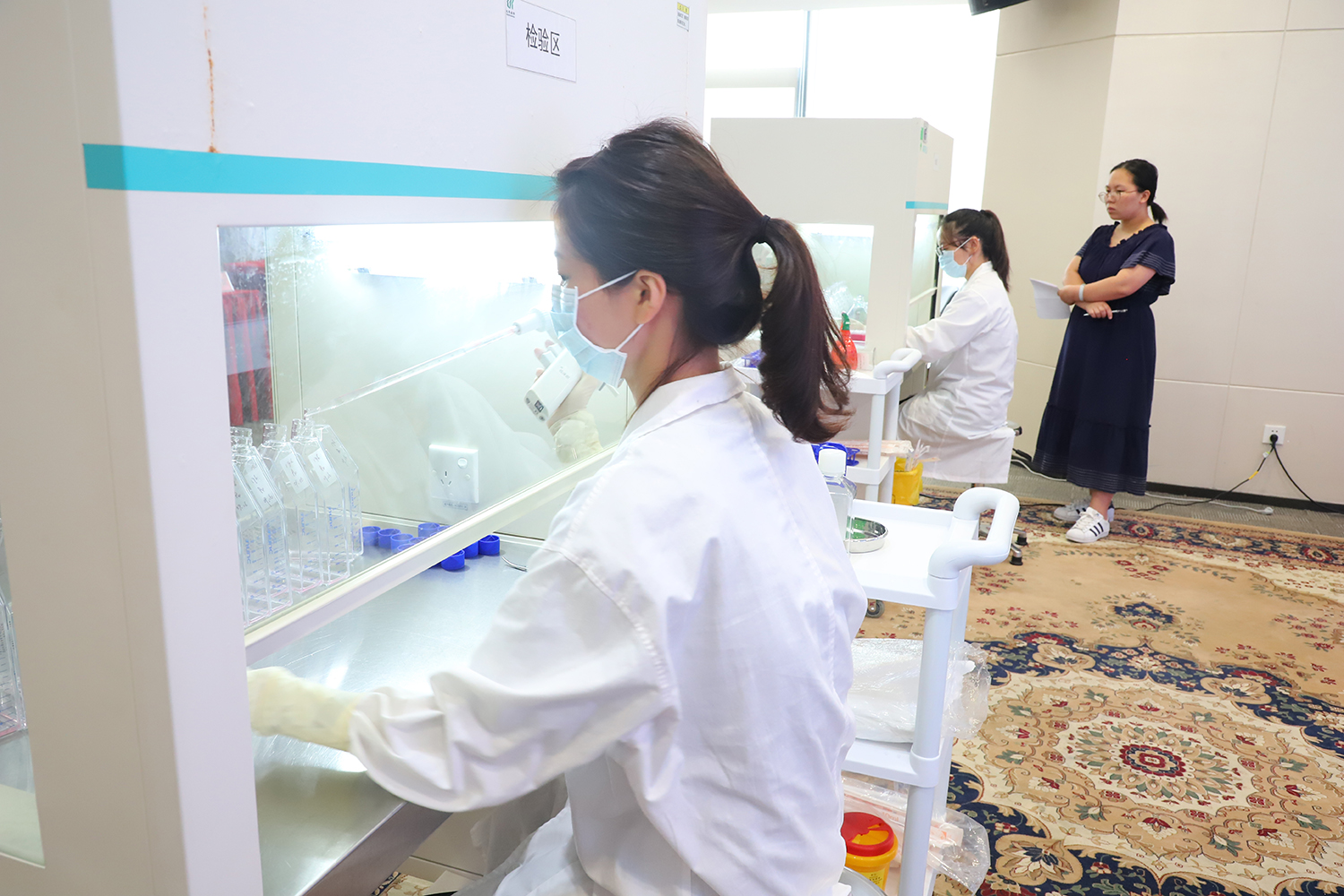 專業(yè)組的細(xì)胞制備工程師們以他們精湛的技能、熟練的操作以及對(duì)每一個(gè)步驟的嚴(yán)格要求贏得了在場(chǎng)同事的陣陣掌聲。而體驗(yàn)組的同事們帶著強(qiáng)烈的好奇心和認(rèn)真虛心的好學(xué)精神,體驗(yàn)了制備和檢測(cè)的操作流程和規(guī)范,那些看似簡(jiǎn)單的動(dòng)作,其實(shí)每一步都包含這非常嚴(yán)格的標(biāo)準(zhǔn)化、規(guī)范化要求,而每個(gè)小細(xì)節(jié)的規(guī)范化流程操作,既是對(duì)自己工作的負(fù)責(zé),更是對(duì)每一位北科生物客戶的負(fù)責(zé)。